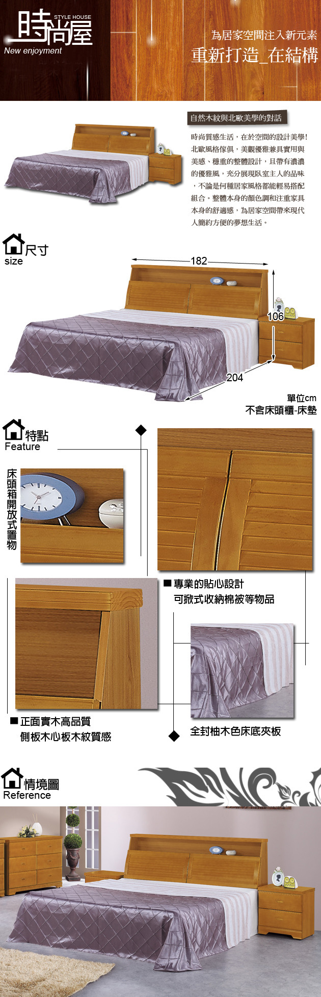 北歐設計簡約風格 不含床頭櫃 床墊 正面實木材質 名稱 威爾特6尺樟木加大雙人床型號 G16 057 3 057 4內容 正面實木 床底全封夾板 側板木心板尺寸 寬182x深204x高106公分 售價:18069