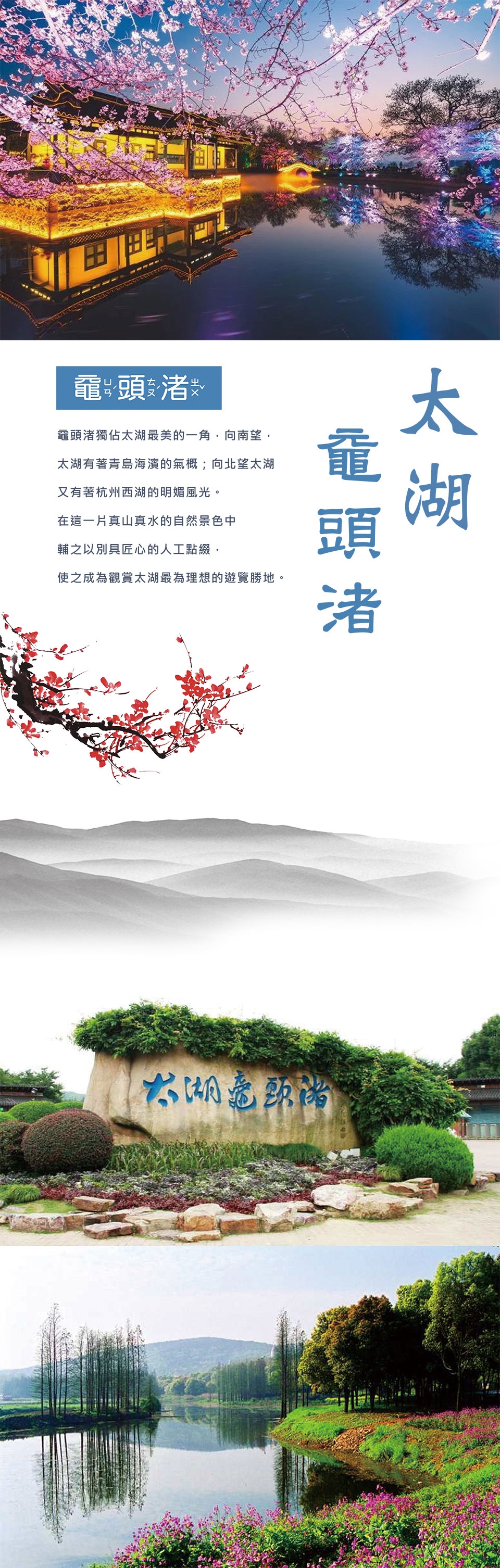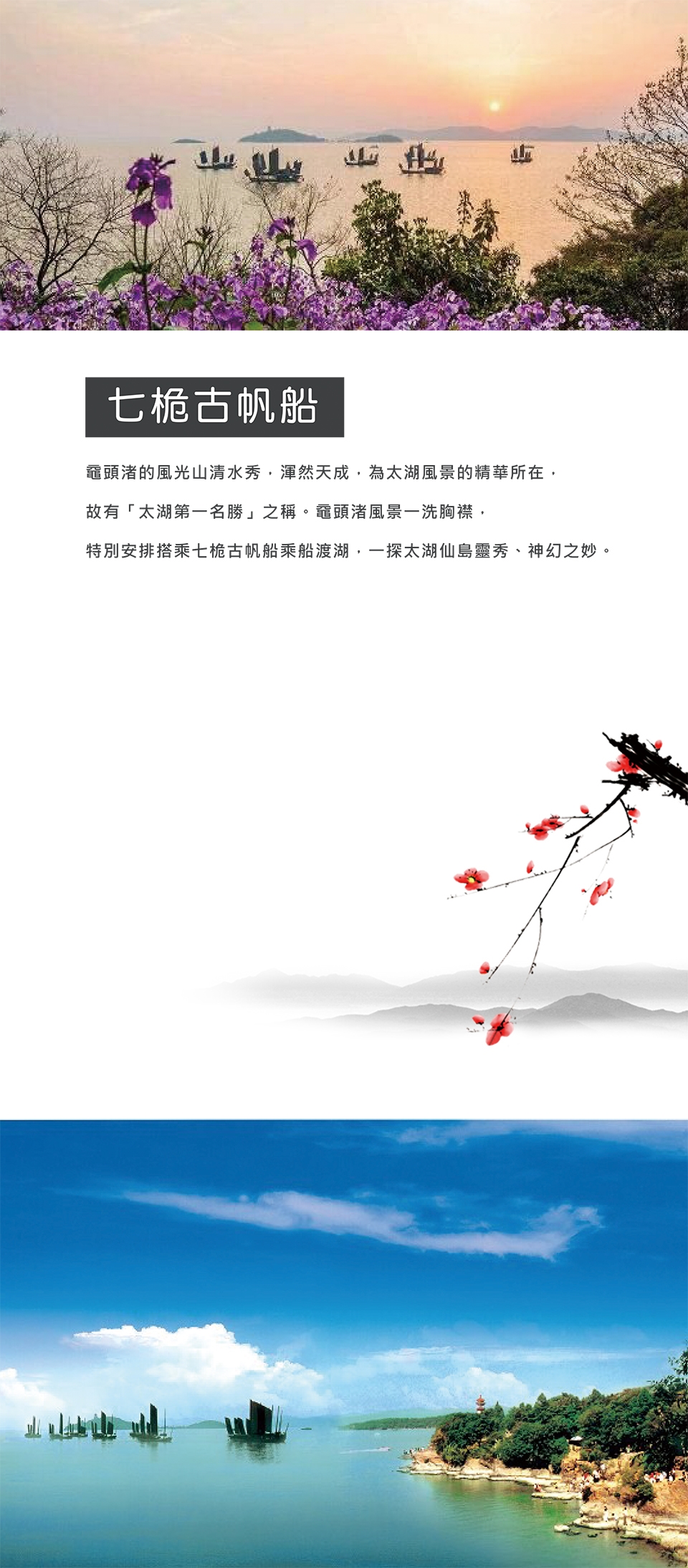 【太湖黿頭渚特別安排搭乘七桅古帆船】 黿頭渚獨佔太湖最美的一角,向南望,太湖有著青島海濱的氣概;向北望太湖又有著杭州 西湖的明媚風光。在這一片真山真水的自然景色中輔之以別具匠心的人工點綴,使之成為觀賞太湖最為理想的遊覽勝地。詩人郭沫若暢遊太湖之後,作出了「太湖佳絕處,畢竟在黿頭」的評價。黿頭渚以其「山不高而秀雅,水不深而遼闊」的無邊景色,晴陰雨景致各異的神奇變幻,吸引著歷代文人墨客和無數中外遊人。遊太湖必遊黿頭渚。黿頭渚的風光山清水秀,渾然天成,為太湖風景的精華所在,故有「太湖第一名勝」之稱。黿頭渚風景一洗胸襟,特別安排搭乘七桅古帆船乘船渡湖,一探太湖仙島靈秀、神幻之妙。