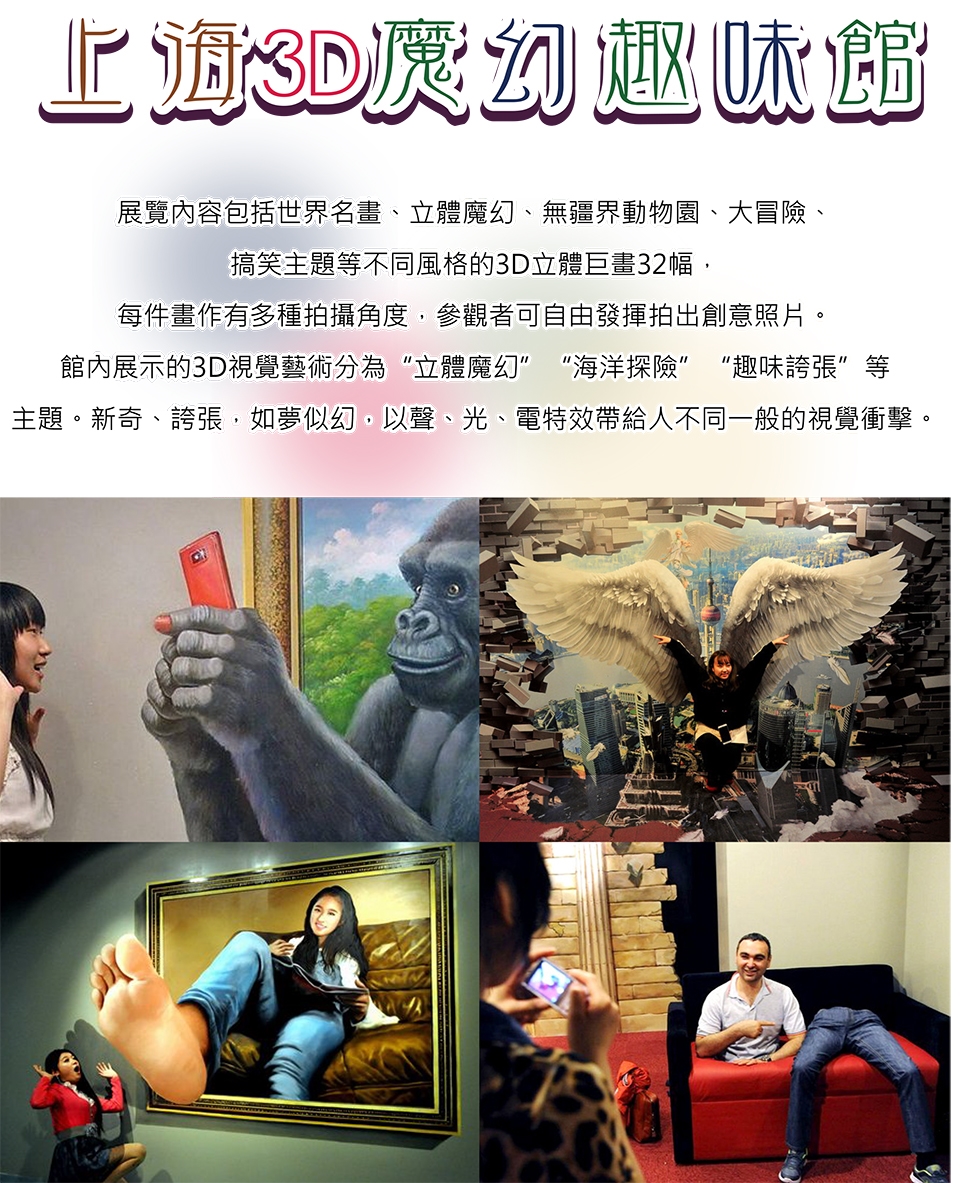 【上海3D魔幻】趣味館 展覽內容包括世界名畫、立體魔幻、無疆界動物園、大冒險、搞笑主題等不同風格的3D立體巨畫32幅,每件畫作有多種拍攝角度,參觀者可自由發揮拍出創意照片。館內展示的3D視覺藝術分為“立體魔幻”“海洋探險”“趣味誇張”等主題。新奇、誇張,如夢似幻,以聲、光、電特效帶給人不同一般的視覺衝擊。