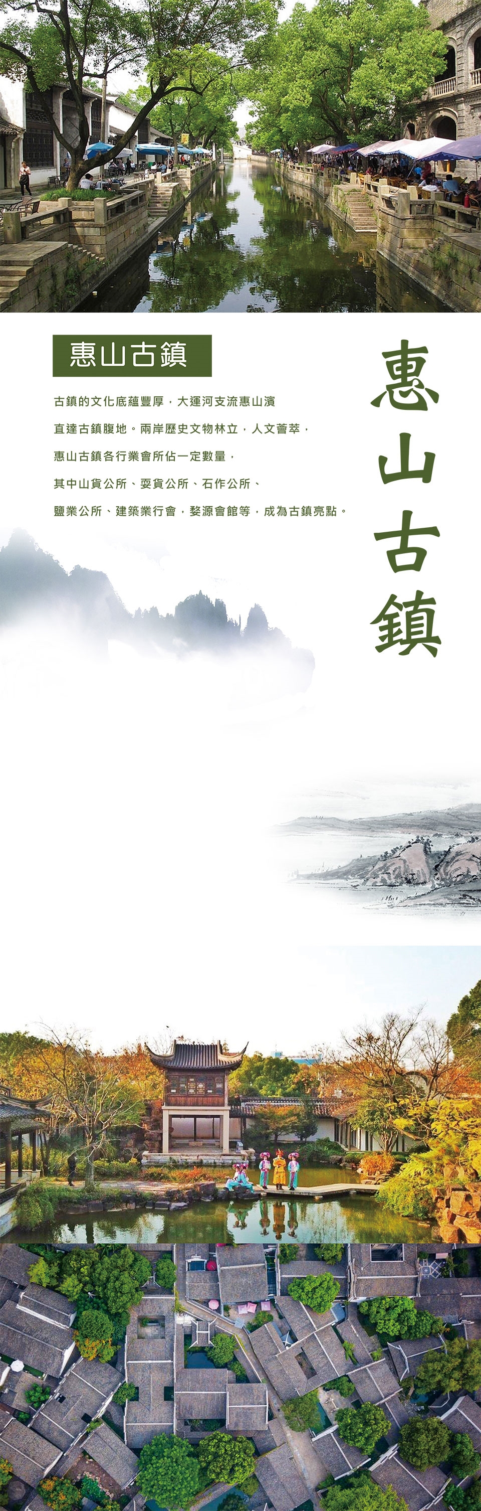 【4000餘年文化底蘊豐厚風景秀麗惠山古鎮】 惠山古鎮地處京杭大運河緊靠其北流經,史前文化距今已4000餘年,有錫山先民施墩遺址。地理位置獨特、自然環境優美、古祠堂群密集分布為特色,呈現老街坊風貌保存完好的唯一街區。2006年6月,經中國國務院批准,公佈惠山古鎮祠堂群為中國重點文物保護單位。惠山古鎮已被納入世界文化遺產預備錄名單。古鎮的文化底蘊豐厚,大運河支流惠山濱直達古鎮腹地。兩岸歷史文物林立,人文薈萃,惠山古鎮各行業會所佔一定數量,其中山貨公所、耍貨公所、石作公所、鹽業公所、建築業行會,婺源會館等,成為古鎮亮點。惠山古鎮具有水陸二條交通線,水路由京杭大運支流三里至古鎮腹地,交通十分便利。