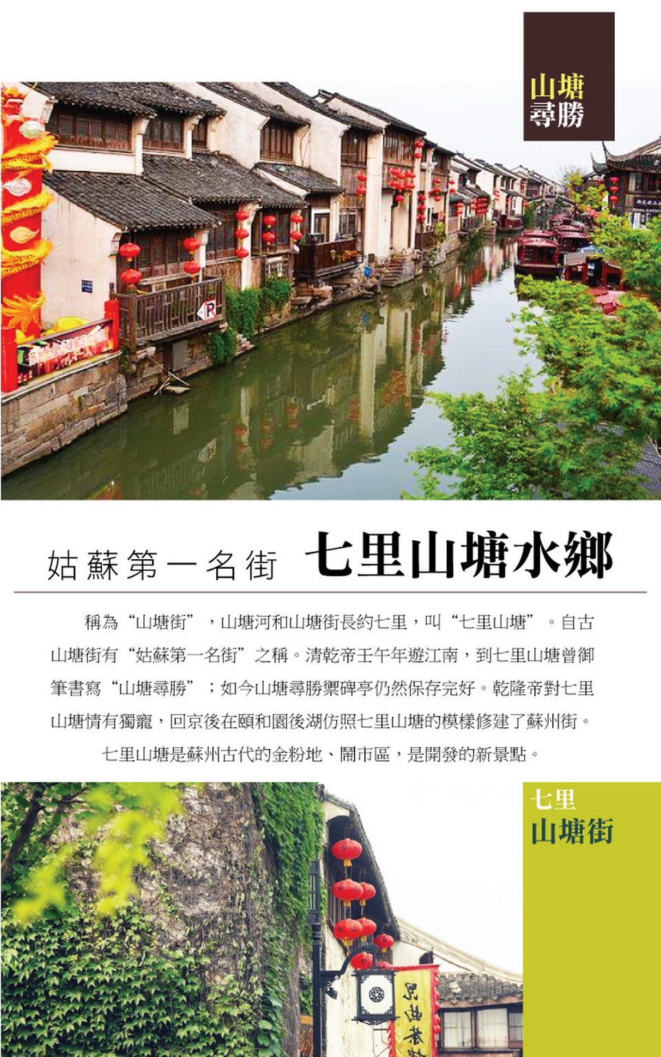 【姑蘇第一名街七里山塘水鄉】 稱為“山塘街”,山塘河和山塘街長約七里,叫“七里山塘”。自古山塘街有“姑蘇第一名街”之稱。清乾帝壬午年遊江南,到七里山塘曾御筆書寫“山塘尋勝”;如今山塘尋勝禦碑亭仍然保存完好。乾隆帝對七里山塘情有獨寵,回京後在頤和園後湖仿照七里山塘的模樣修建了蘇州街。七里山塘是蘇州古代的金粉地、鬧市區,是開發的新景點。