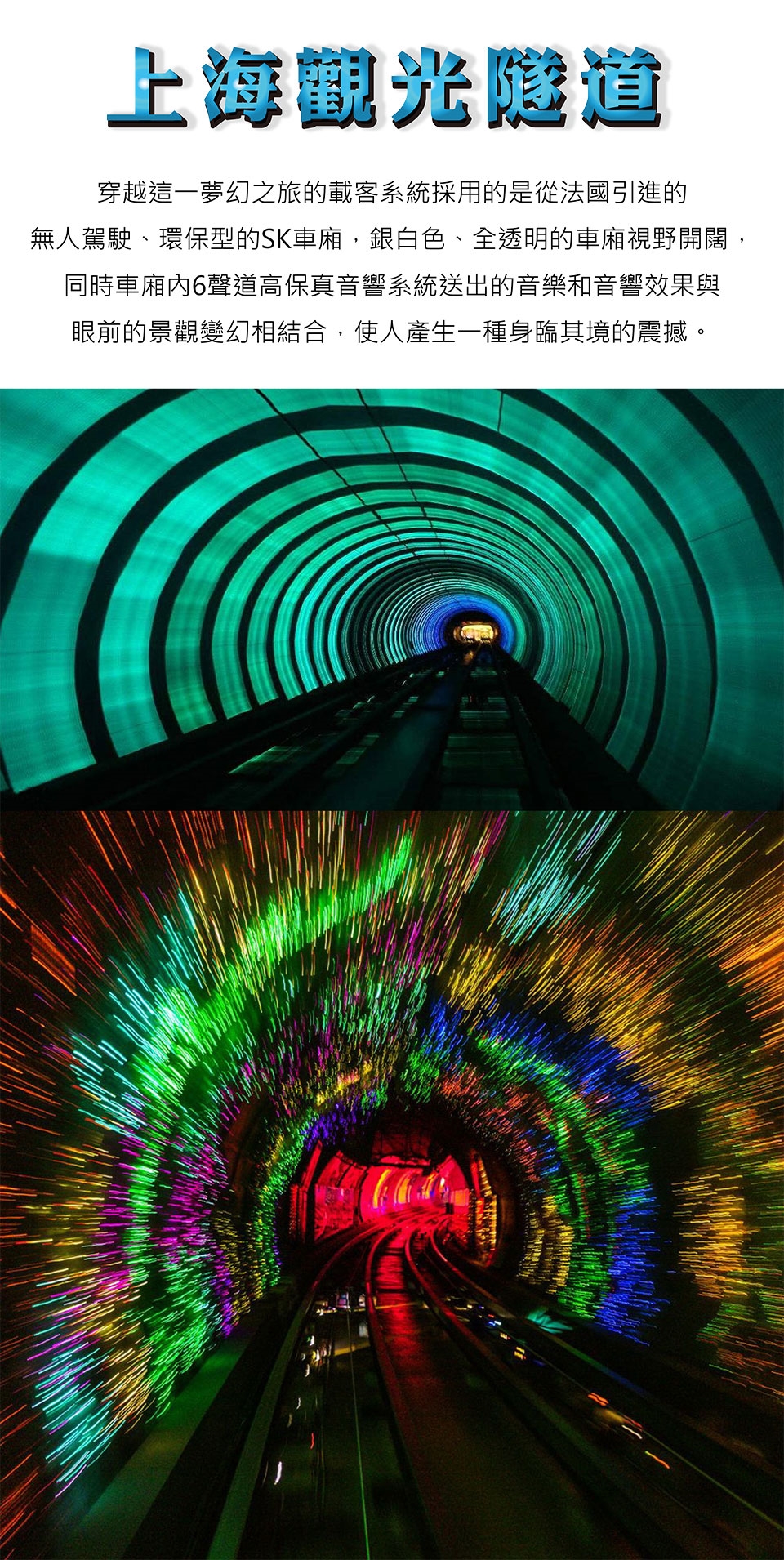 【上海觀光隧道】 保持浦西外灘和浦東濱江大道的環境協調、完整。隧道內壁由高科技手段營造的各種奇異的色彩變換不停,黃色的海星,粉色的花朵,形狀各異的幾何圖案,各種充滿生機的地球生物,躍動著生命的力量,引人遐思。而穿越這一夢幻之旅的載客系統採用的是從法國引進的無人駕駛、環保型的SK車廂,銀白色、全透明的車廂視野開闊,同時車廂內6聲道高保真音響系統送出的音樂和音響效果與眼前的景觀變幻相結合,使人產生一種身臨其境的震撼。