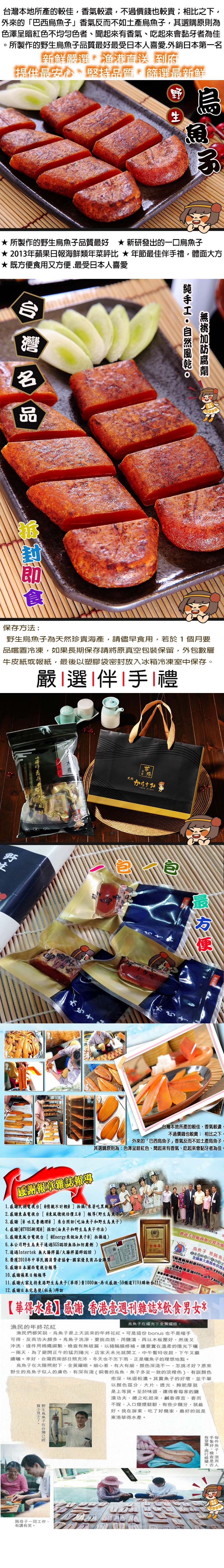 既方便食用又可隨身攜帶 所製作的野生烏魚子品質最好 2013年蘋果日報海鮮類年菜評 品牌 華得水產類型 海鮮組合及加工品肉品組成 原塊組合說明 碳烤一口包野生烏魚子 售價:5175